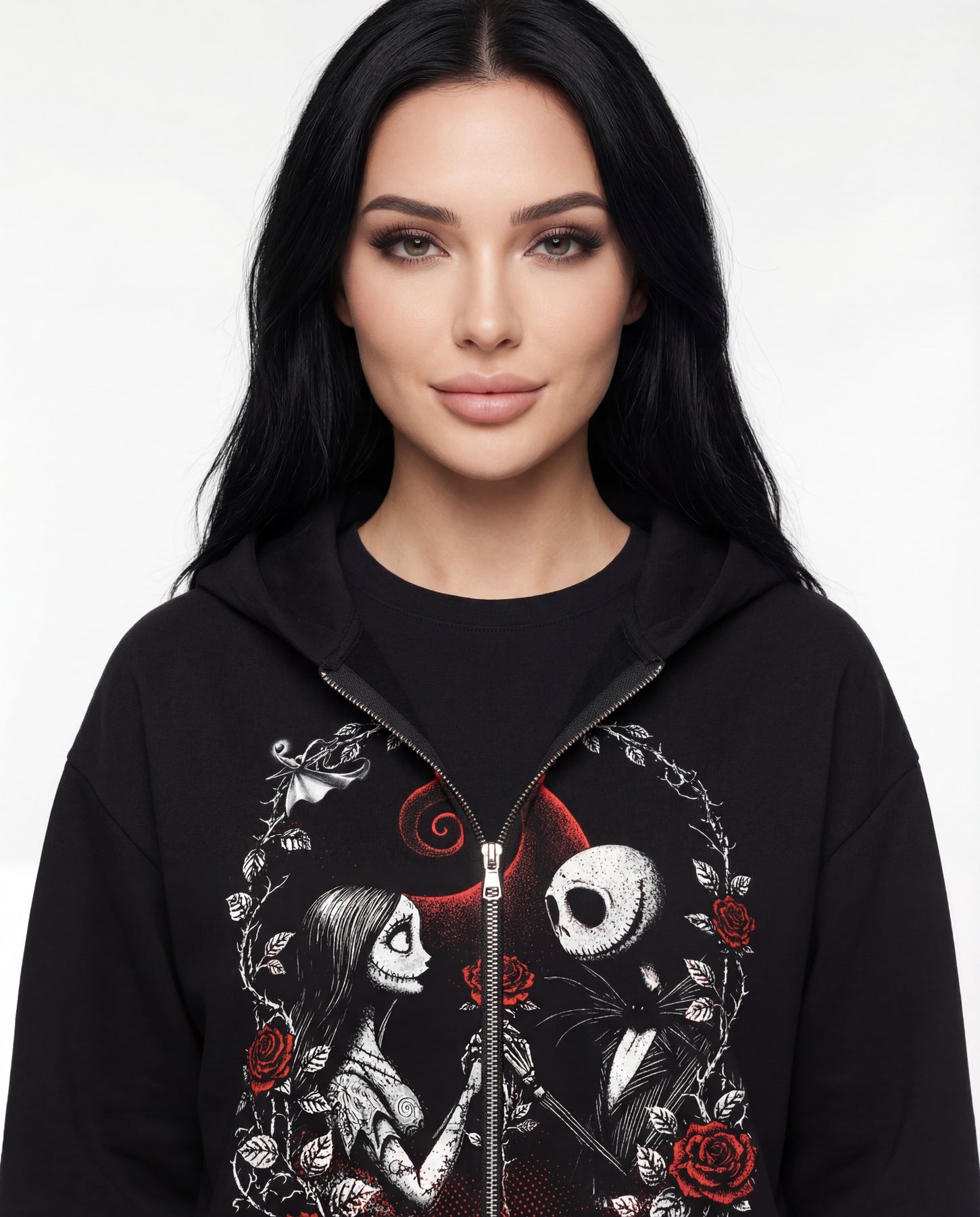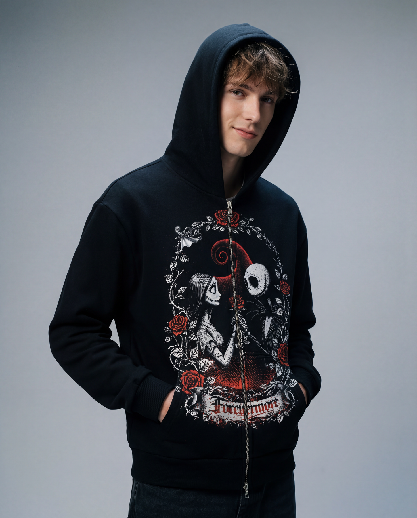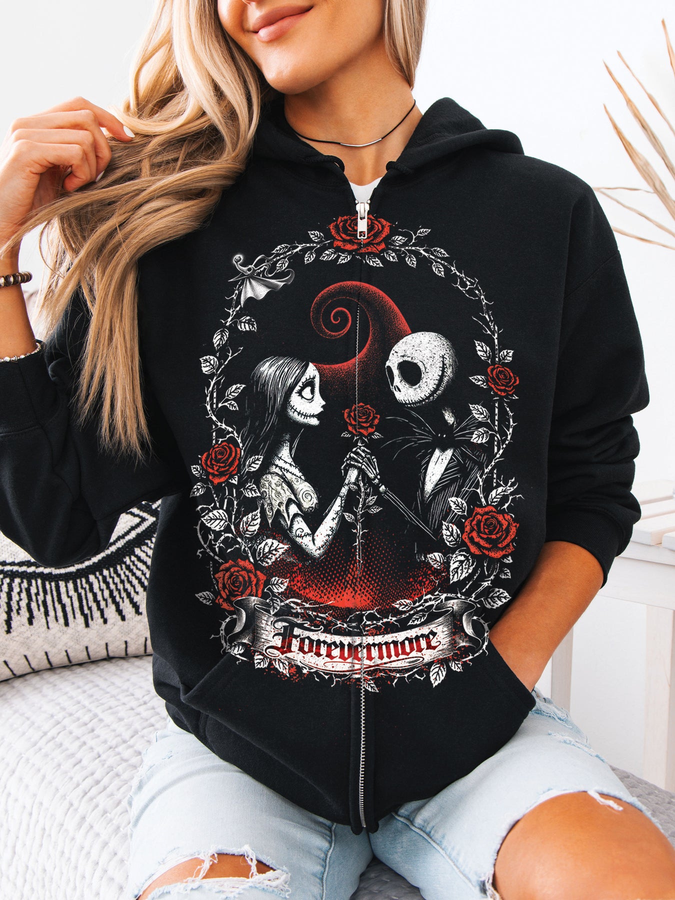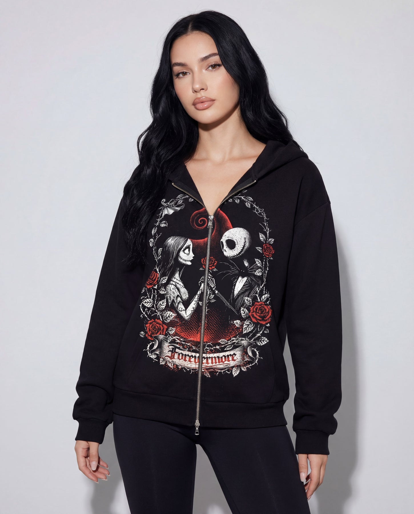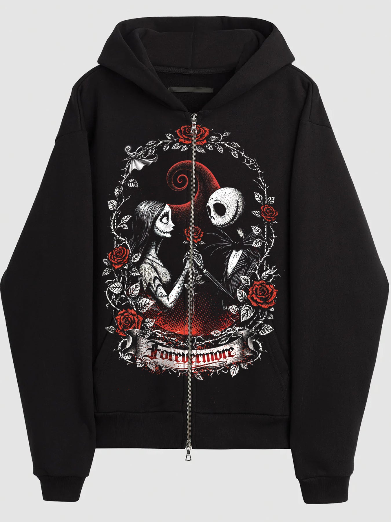 Fall in love with a timeless Disney romance! This Nightmare Before Christmas hoodie features Jack and Sally captured in an elegant Victorian floral wreath, surrounded by deep red roses and gothic detailing. The romantic “Forevermore” banner ties the design together, symbolizing love that lasts beyond Halloween — and beyond time itself.
